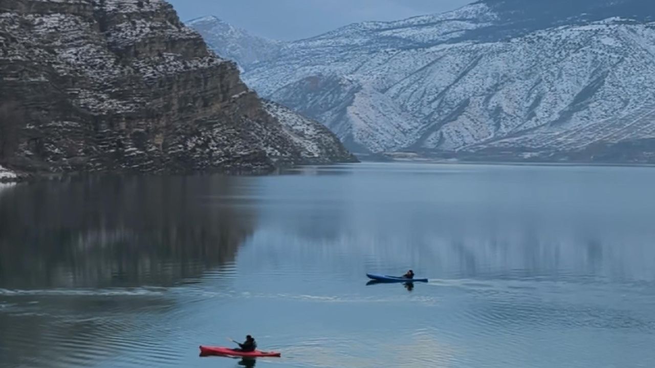 Önemli turizm merkezlerinden biri olan Tortum Gölü'nde hava Erzurum'a göre daha sıcak. Kış aylarında kar yağışının diğer bölgelere göre daha az yaşandığı Tortum Gölü'ne giden bir grup arkadaş, kano keyfi yaptı. Her türlü su sporuna elverişli olan gölde kanolarıyla gezinti yapan arkadaşlar, dronla da görüntü çekti.