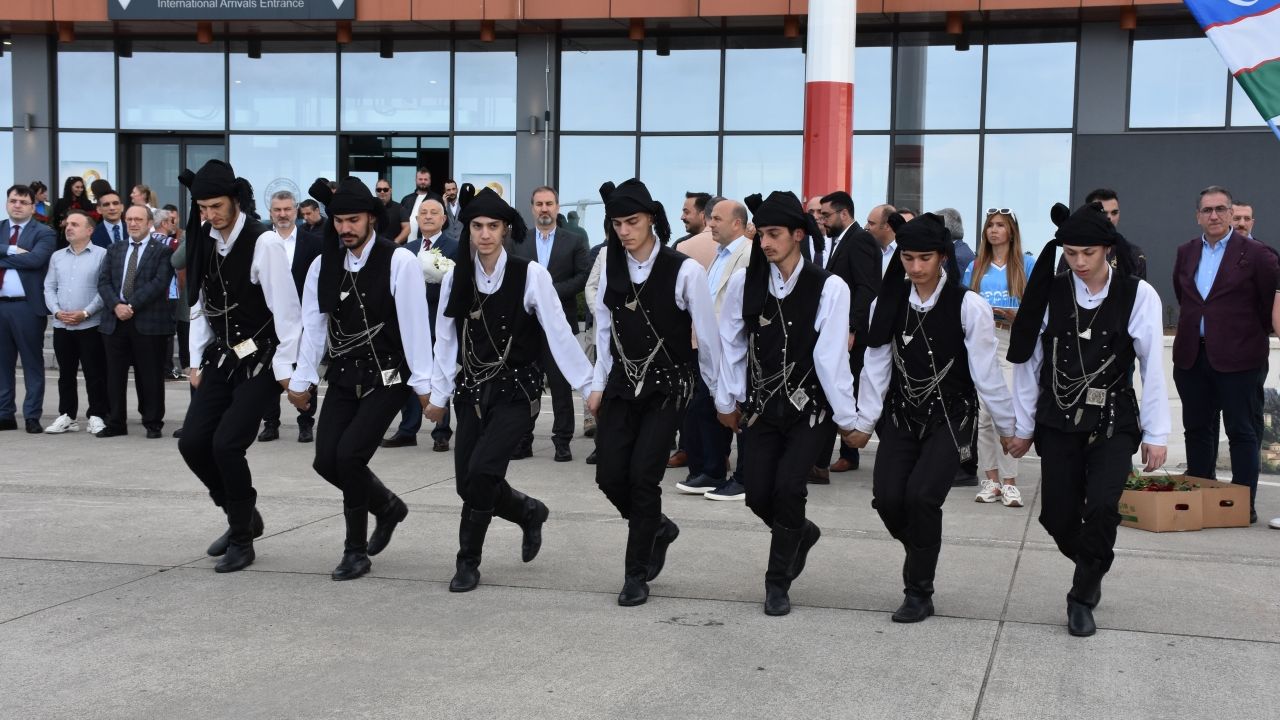 Trabzon Havalimanı'na inen uçak için apronda su takı töreni yapıldı. Uçaktan Türkiye, Özbekistan ve Trabzonspor bayrağı eşliğinde inen yolculara, halk oyunları ekipleri gösteri sundu. Bazıları Trabzonspor forması giyen yolcular, çiçek, keşan ve ikramlarla karşılandı.