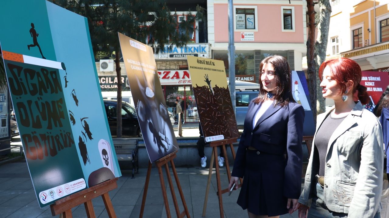Akçaabat Atatürk Parkı'nda gerçekleştirilen sergide, Güzel Sanatlar ve Tasarım Fakültesi öğrencilerinin tütün, alkol, kumar, teknoloji ve yemek gibi bağımlılıklara dikkati çekmek amacıyla hazırladığı afişler yer aldı.