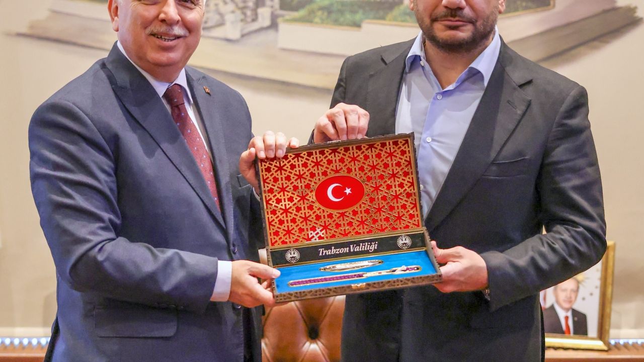 Vali Aziz Yıldırım, Ertuğrul Doğan'a bordo-mavi tespih ile el yapımı Sürmene çakısı hediye etti.