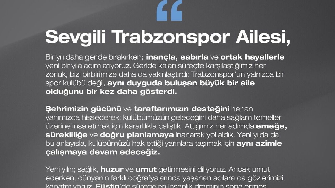 'Sevgili Trabzonspor Ailesi, Bir yılı daha geride bırakırken; inançla, sabırla ve ortak hayallerle yeni bir yıla adım atıyoruz. Geride kalan süreçte karşılaştığımız her zorluk, bizi birbirimize daha da yakınlaştırdı; Trabzonspor'un yalnızca bir spor kulübü değil, aynı duyguda buluşan büyük bir aile olduğunu bir kez daha gösterdi. Şehrimizin gücünü ve taraftarımızın desteğini her an yanımızda hissederek; kulübümüzün geleceğini daha sağlam temeller üzerine inşa etmek için kararlılıkla çalıştık. Attığımız her adımda emeğe, sürekliliğe ve doğru planlamaya inanarak yol aldık. Yeni yılda da bu anlayışla, kulübümüzü hak ettiği yarınlara taşımak için aynı azimle çalışmaya devam edeceğiz. Yeni yılın; sağlık, huzur ve umut getirmesini diliyoruz. Ancak umut ederken, dünyanın farklı coğrafyalarında yaşanan acılara da gözlerimizi kapatmıyoruz. Filistin'de süregelen insanlık dramının sona ermesi, masumların artık zarar görmemesi en büyük temennimizdir. Barışın, merhametin ve vicdanın egemen olduğu bir dünyanın mümkün olduğuna inanıyoruz. Bu duygularla; camiamız başta olmak üzere tüm insanlığa barış, huzur ve dayanışma dolu bir yıl diliyorum. Yeni yılınız kutlu olsun.'