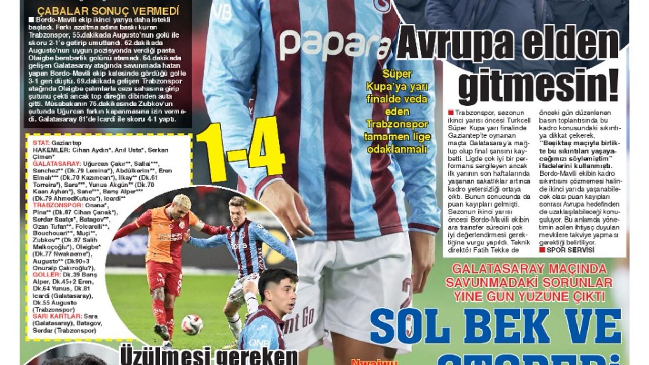 Bordo mavili camiada Süper Kupa Yarı Finali'nde Galatasaray'a karşı 4-1'lik mağlubiyet sonrası tartışmaların ana gündemi ise kadro derinliği, savunma hatları ve transfer stratejileri oldu. Trabzonspor'da gözler yapılacak transferlere çevrildi.