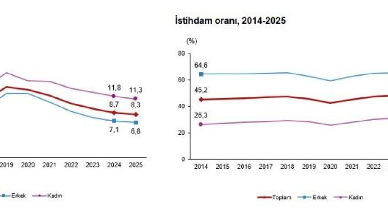 TÜİK, 2025 yılına ilişkin iş gücü istatistiklerini açıkladı. Buna göre; 15 ve daha yukarı yaştaki kişilerde işsiz sayısı 2025 yılında bir önceki yıla göre 147 bin kişi azalarak 2 milyon 966 bin kişi oldu. İşsizlik oranı ise 0,4 puan azalarak yüzde 8,3 seviyesinde gerçekleşti. İşsizlik oranı erkeklerde yüzde 6,8 iken kadınlarda yüzde 11,3 oldu. İstihdam edilenlerin sayısı 2025 yılında bir önceki yıla göre 54 bin kişi azalarak 32 milyon 566 bin kişi, istihdam oranı ise 0,5 puan azalarak yüzde 49,0 oldu. Bu oran erkeklerde yüzde 66,4 iken kadınlarda yüzde 32,1 olarak gerçekleşti. İş gücü 2025 yılında bir önceki yıla göre 200 bin kişi azalarak 35 milyon 533 bin kişi, iş gücüne katılma oranı ise 0,7 puan azalarak yüzde 53,5 olarak gerçekleşti. İş gücüne katılma oranı erkeklerde yüzde 71,3, kadınlarda ise yüzde 36,2 oldu.