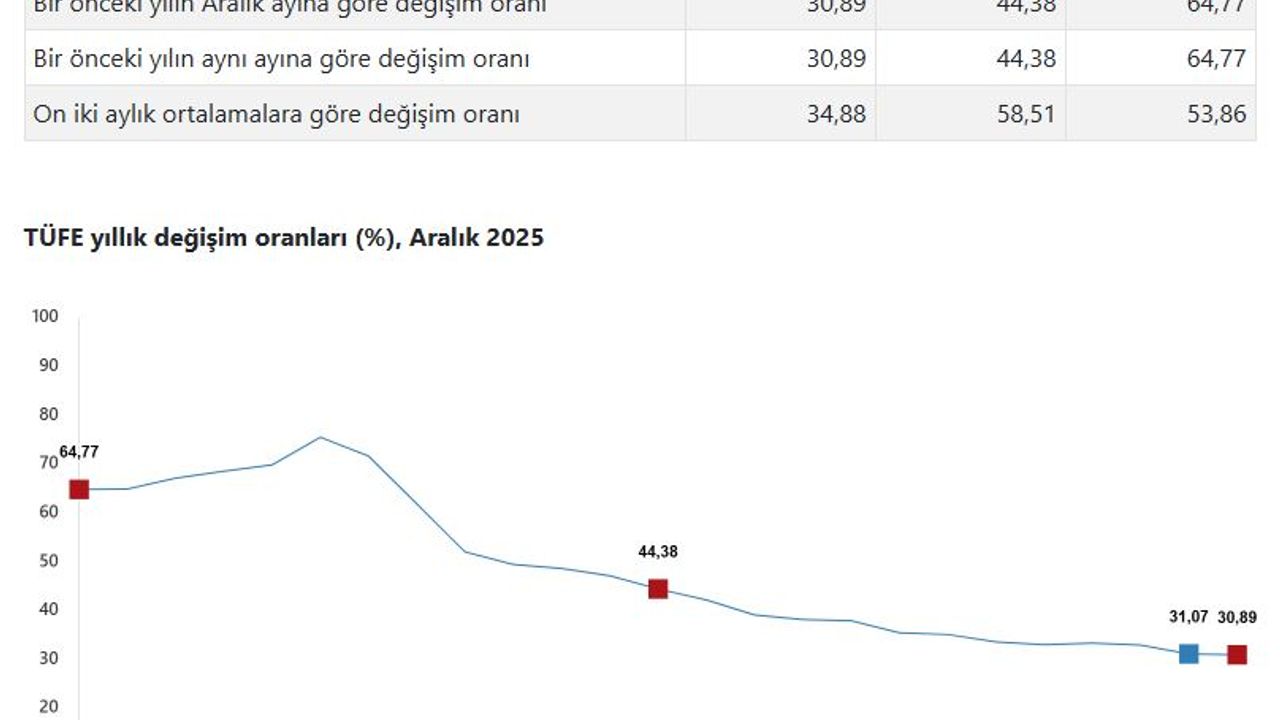 TÜİK, Aralık 2025 dönemine ilişkin enflasyon verilerini açıkladı. Buna göre; tüketici fiyatları aralık ayında bir önceki aya göre yüzde 0,89, bir önceki yılın aynı ayına göre yüzde 30,89 ve 12 aylık ortalamalara göre yüzde 34,88 arttı.