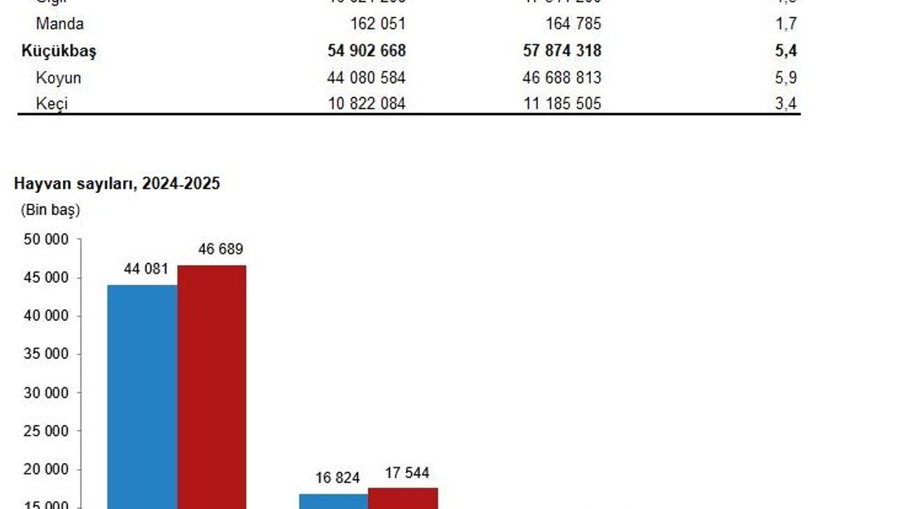 TÜİK, 2025 dönemine ilişkin hayvansal üretim istatistiklerini açıkladı. Buna göre, büyükbaş sayısı bir önceki yıla göre yüzde 4,3 artarak 17 milyon 709 bin baş oldu. Büyükbaş kategorisinde, sığır sayısı bir önceki yıla göre yüzde 4,3 artarak 17 milyon 544 bin baş, manda sayısı ise bir önceki yıla göre yüzde 1,7 artarak 164 bin 785 baş oldu. Küçükbaş sayısı bir önceki yıla göre yüzde 5,4 artarak 57 milyon 874 bin baş oldu. Küçükbaş kategorisinde, koyun sayısı bir önceki yıla göre yüzde 5,9 oranında artarak 46 milyon 689 bin baş, keçi sayısı ise bir önceki yıla göre yüzde 3,4 oranında artarak 11 milyon 186 bin baş oldu.
