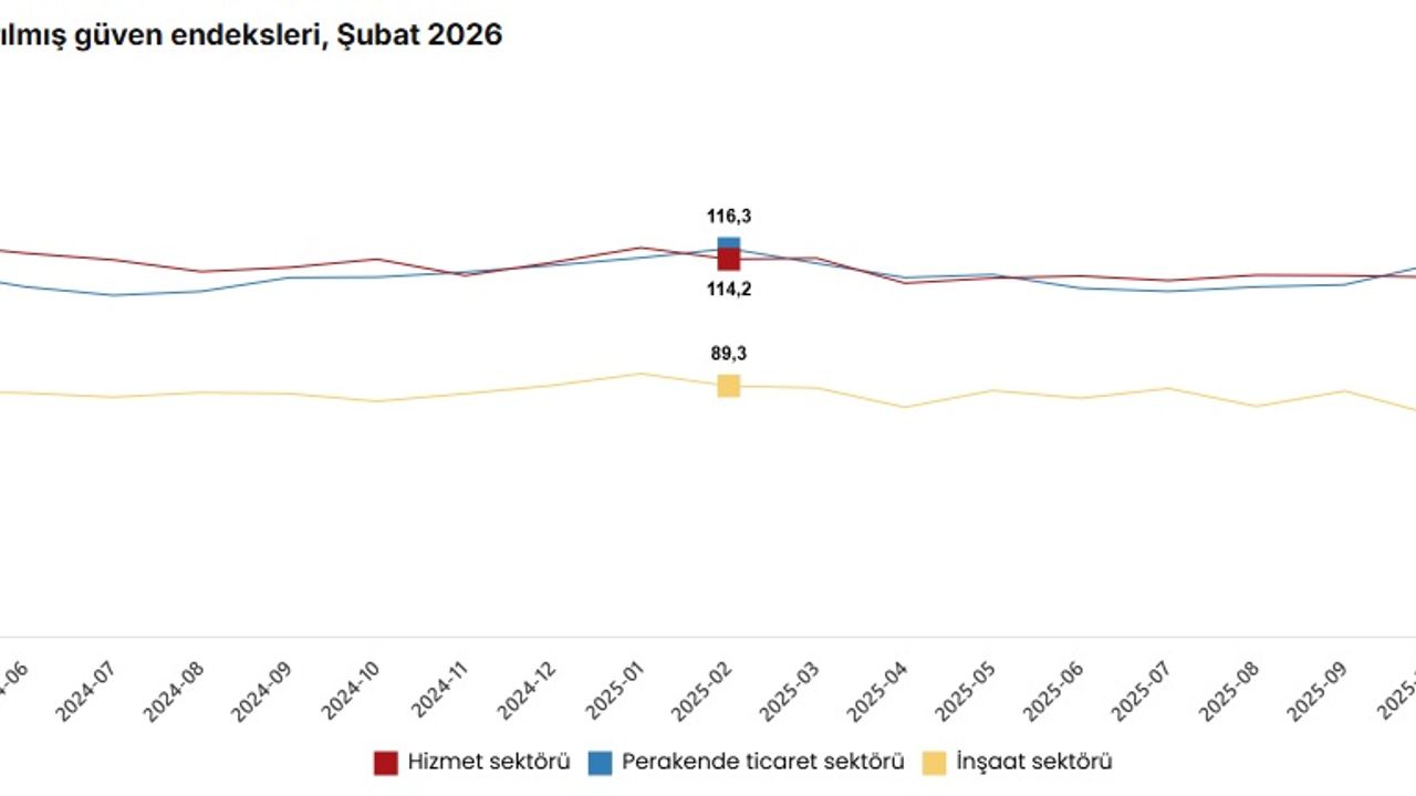 TÜİK, Şubat 2026 dönemine ilişkin hizmet, perakende ticaret ve inşaat güven endekslerini açıkladı. Buna göre; mevsim etkilerinden arındırılmış güven endeksi şubat ayında bir önceki aya göre; hizmet sektöründe aynı düzeyde kalarak 113,8 değerini, perakende ticaret sektöründe yüzde 2,9 oranında artarak 115,9 değerini ve inşaat sektöründe yüzde 2,1 oranında azalarak 83,9 değerini aldı. (DHA)