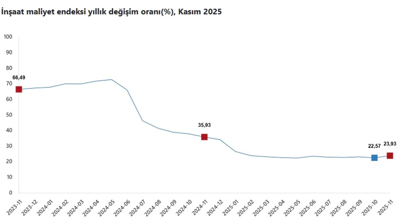 TÜİK, Kasım 2024 dönemine ilişkin inşaat maliyet endeksi verilerini açıkladı. Buna göre; inşaat maliyet endeksi, bir önceki aya göre yüzde 1,14 arttı, bir önceki yılın aynı ayına göre yüzde 23,93 arttı. Bir önceki aya göre malzeme endeksi yüzde 1,70 arttı, işçilik endeksi yüzde 0,12 arttı. Ayrıca bir önceki yılın aynı ayına göre malzeme endeksi yüzde 20,48 arttı, işçilik endeksi yüzde 30,98 arttı.