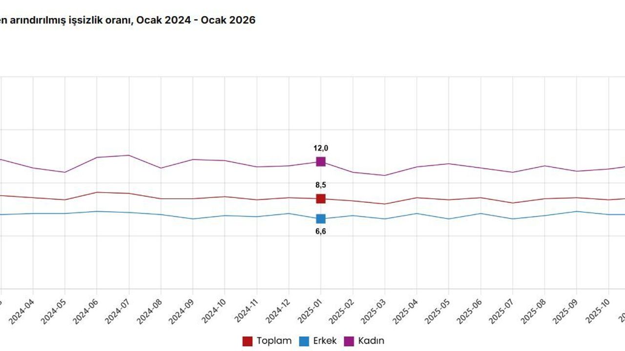 TÜİK, Ocak 2025 dönemine ilişkin iş gücü istatistiklerini açıkladı. Buna göre; 5 ve daha yukarı yaştaki kişilerde işsiz sayısı 2026 yılı Ocak ayında bir önceki aya göre 73 bin kişi artarak 2 milyon 819 bin kişi oldu. İşsizlik oranı 0,3 puan artarak yüzde 8,1 seviyesinde gerçekleşti. İşsizlik oranı erkeklerde yüzde 6,6 iken kadınlarda yüzde 11 olarak gerçekleşti.