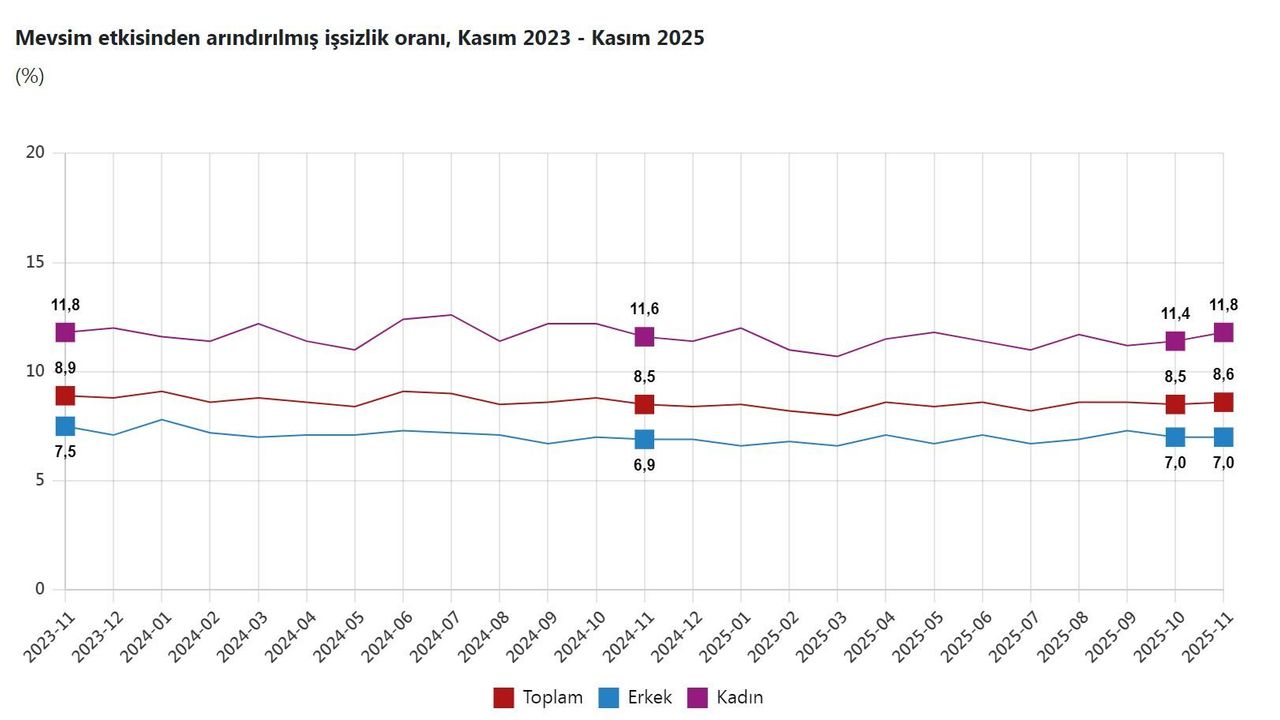 TÜİK, Kasım 2025 dönemine ilişkin iş gücü istatistiklerini açıkladı. Buna göre; 15 ve daha yukarı yaştaki kişilerde işsiz sayısı 2025 yılı Kasım ayında bir önceki aya göre 54 bin kişi artarak 3 milyon 98 bin kişi oldu. İşsizlik oranı 0,1 puan artarak yüzde 8,6 seviyesinde gerçekleşti. İşsizlik oranı erkeklerde yüzde 7 iken, kadınlarda yüzde 11,8 olarak tahmin edildi. İstihdam edilenlerin sayısı 2025 yılı Kasım ayında bir önceki aya göre 75 bin kişi artarak 32 milyon 737 bin kişi, istihdam oranı 0,1 puan artarak yüzde 49,2 oldu. Bu oran erkeklerde yüzde 66,8 iken, kadınlarda yüzde 31,9 olarak gerçekleşti. İşgücü, 2025 yılı Kasım ayında bir önceki aya göre 128 bin kişi artarak 35 milyon 834 bin kişi, işgücüne katılma oranı ise 0,1 puan artarak yüzde 53,8 olarak gerçekleşti. İşgücüne katılma oranı erkeklerde yüzde 71,8 iken, kadınlarda yüzde 36,2 oldu.