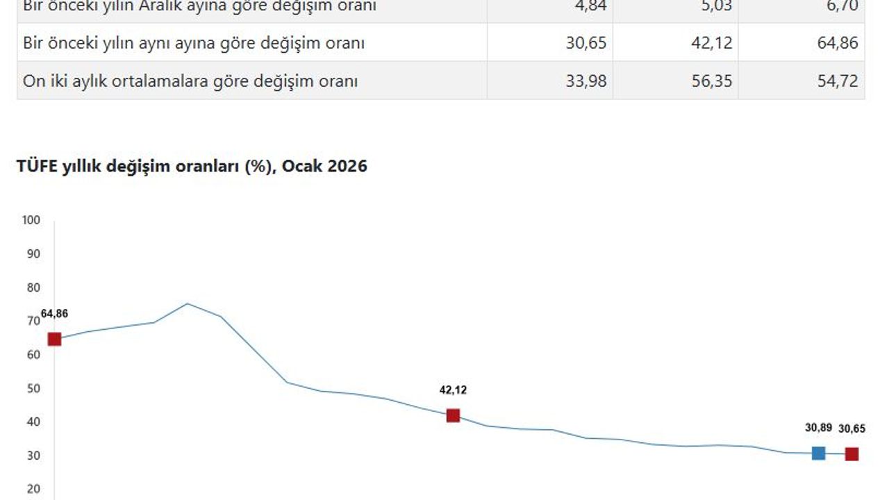 TÜİK, Ocak 2026 dönemine ilişkin enflasyon verilerini açıkladı. Buna göre; tüketici fiyatları ocak ayında bir önceki aya göre yüzde 4,84, bir önceki yılın aynı ayına göre yüzde 30,65 ve 12 aylık ortalamalara göre yüzde 33,98 arttı.