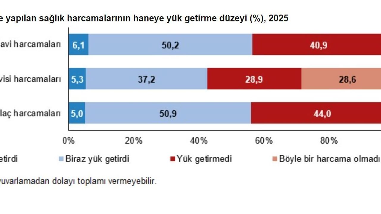 Araştırma sonuçlarında; doktor muayene ve tedavi harcamalarının hanelerin yüzde 6,1'ine çok yük getirdiği, yüzde 50,2'sine biraz yük getirdiği, yüzde 40,9'una ise yük getirmediği görüldü. Diş muayene ve tedavi harcamaları ise hanelerin yüzde 5,3'üne çok, yüzde 37,2'sine biraz yük getirirken, yüzde 28,9'una yük getirmedi. İlaç harcamaları ise hanelerin yüzde 5'ine çok, yüzde 50,9'una biraz yük getirdi. Ayrıca hanelerin yüzde 44'ü ilaç harcamalarının yük getirmediğini belirtti. Son 12 ay içinde hanelerin yüzde 2,7'si muayene veya tedavi, yüzde 28,6'sı diş muayenesi veya tedavisi, yüzde 0,1'i ise ilaç harcaması yapmadı.