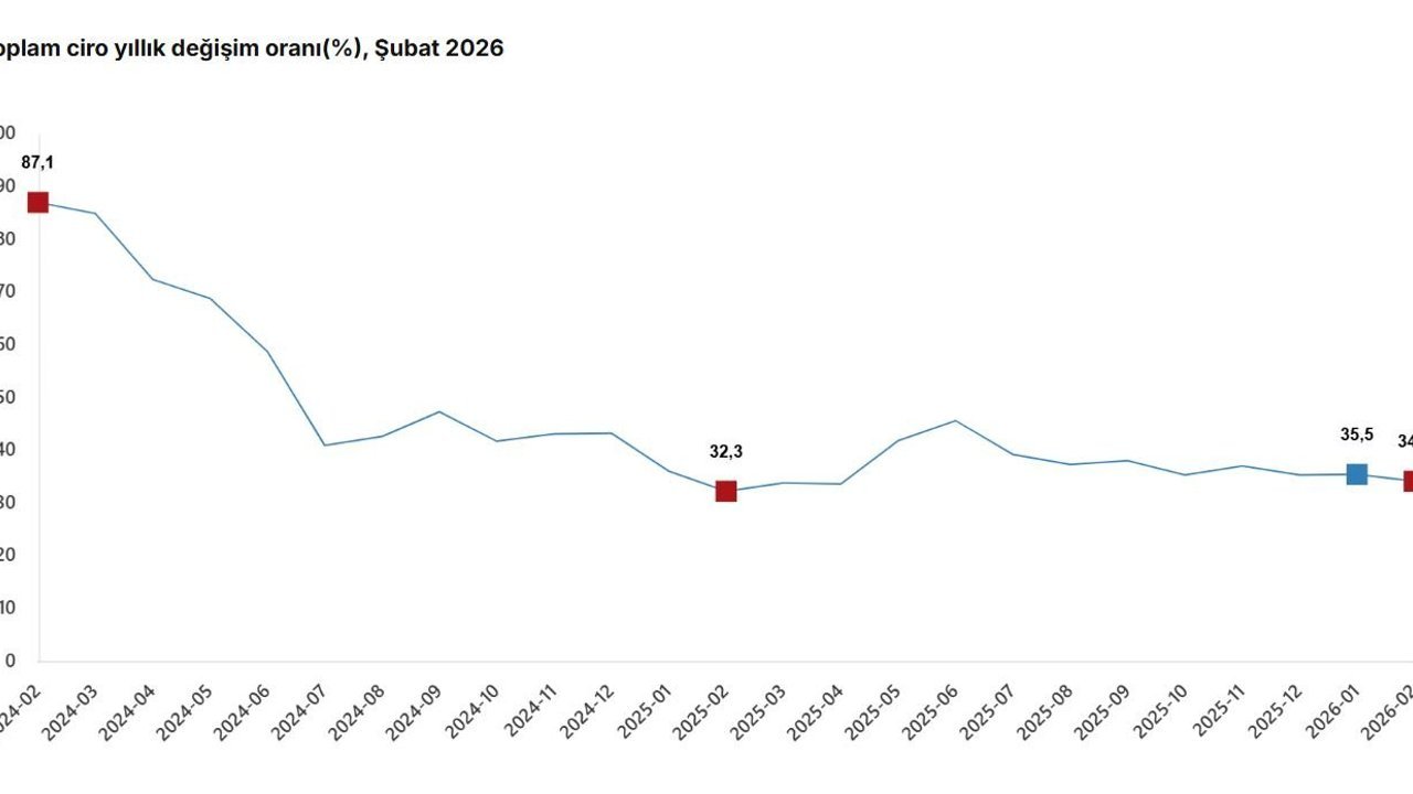 TÜİK, Şubat 2026 dönemine ilişkin ciro ve ticaret satış hacim endeksi verilerini açıkladı. Buna göre; sanayi, inşaat, ticaret ve hizmet sektörleri toplamında ciro endeksi, 2026 yılı Şubat ayında yıllık yüzde 34,2 arttı. Toplam cironun alt detaylarına bakıldığında; 2026 yılı Şubat ayında yıllık sanayi sektörü ciro endeksi yüzde 31,7 arttı, inşaat ciro endeksi yüzde 20,2 arttı, ticaret ciro endeksi yüzde 36,8 arttı, hizmet ciro endeksi yüzde 34,6 arttı.
