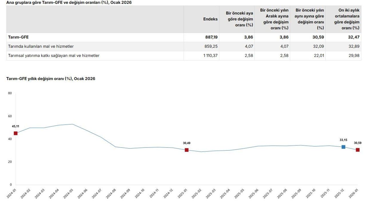TÜİK, Ocak 2026 dönemine ilişkin tarımsal girdi fiyat endeksi verilerini açıkladı. Buna göre; tarımsal girdi fiyatları 2026 yılı Ocak ayında bir önceki aya göre yüzde 3,86 artış, bir önceki yılın aralık ayına göre yüzde 3,86 artış, bir önceki yılın aynı ayına göre yüzde 30,59 artış ve 12 aylık ortalamalara göre yüzde 32,47 artış gerçekleşti. Ana gruplarda bir önceki aya göre; tarımda kullanılan mal ve hizmetler endeksinde yüzde 4,07 artış, tarımsal yatırıma katkı sağlayan mal ve hizmetler endeksinde yüzde 2,58 artış gerçekleşti. Bir önceki yılın aynı ayına göre tarımda kullanılan mal ve hizmetler endeksinde yüzde 32,09 artış, tarımsal yatırıma katkı sağlayan mal ve hizmetler endeksinde yüzde 22,01 artış gerçekleşti. Yıllık değişimin en yüksek olduğu alt grup yüzde 43,74 artış ile veteriner harcamaları, aylık değişimin en yüksek olduğu alt grup yüzde 13,28 artış ile diğer mal ve hizmetler oldu. (DHA)