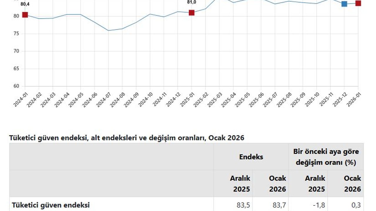 ANKARA, (DHA)- TÜRKİYE İstatistik Kurumu (TÜİK), tüketici güven endeksinin ocakta aylık yüzde 0,3 oranında artarak 83,7 olduğunu açıkladı.