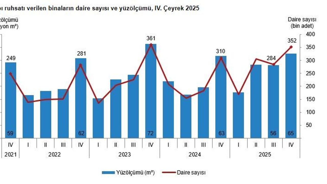 Umutcan ÖREN/ANKARA, (DHA)- TÜRKİYE İstatistik Kurumu (TÜİK), 2025 yılı 4'üncü çeyreğinde, yetkili idareler tarafından yapı ruhsatı verilen toplam yüz ölçümünün yıllık yüzde 2,6 arttığını açıkladı.