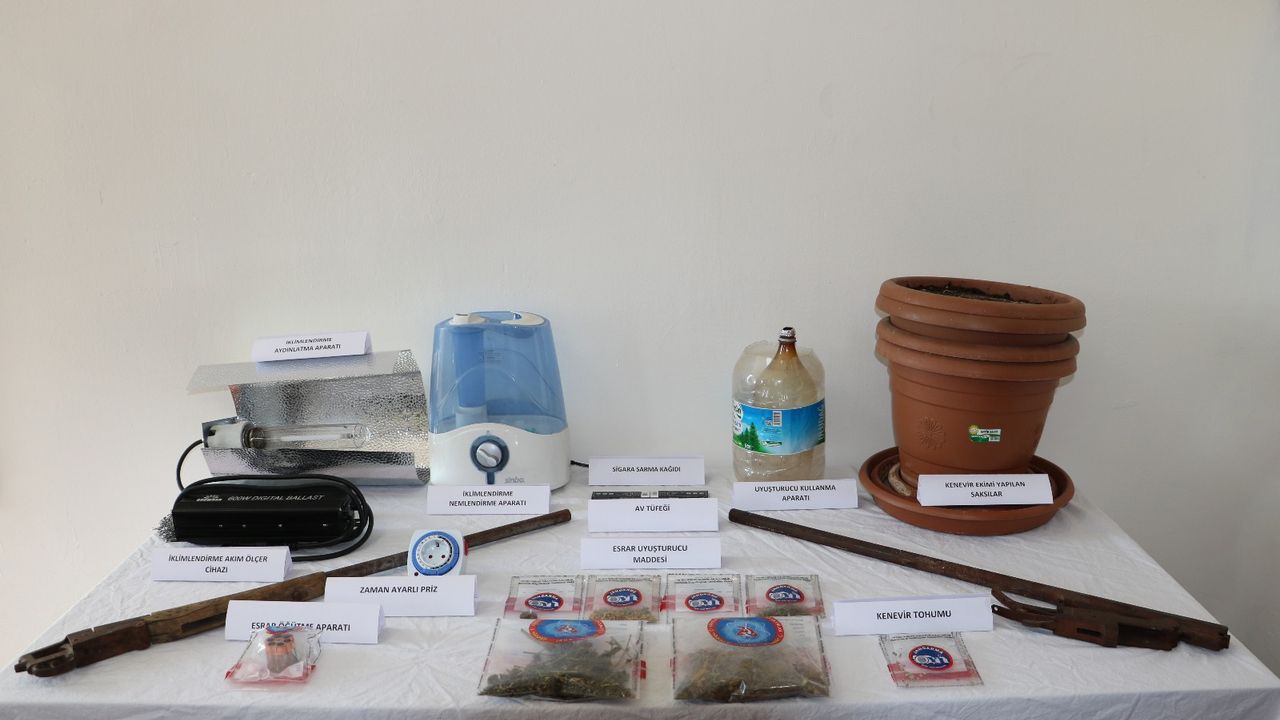 Belirlenen adrese operasyon düzenleyen ekipler, şüpheliyi gözaltına alarak kullanıma hazır 100 gram kubar esrar, uyuşturucu madde tohumu, uyuşturucu madde üretiminde kullanılan filizlendirme iklimlendirme sistemi, 600 wattlık ampul, uyuşturucu üretiminde kullanılan nemlendirme aparatı, akım ölçer cihazı, zaman ayarlı priz, esrar öğütme aparatı, uyuşturucu kullanma aparatı ve 2 ruhsatsız av tüfeği ele geçirdi.