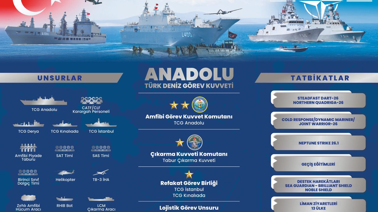 Milli Savunma Bakanlığı'nın sanal medya hesabından yapılan açıklamada, 'NATO Müttefik Reaksiyon Kuvveti bünyesindeki NATO Amfibi Görev Kuvveti Komutanlığı ve Çıkarma Kuvveti Komutanlığı görevleri; 1 Temmuz 2025 tarihinden 30 Haziran 2026 tarihine kadar Türk Deniz Kuvvetleri tarafından üstleniliyor. Bu görevler kapsamında, Anadolu Türk Deniz Görev Kuvveti; CATF ve CLF Karargahları, TCG Anadolu, TCG Derya, TCG İstanbul, TCG Kınalıada, 20 Ocak-23 Nisan 2026 tarihleri arasında Akdeniz, Biskay Körfezi, Manş Denizi, Kuzey Denizi, Baltık Denizi ve Adriyatik Denizi'nde, STEADFAST DART-2026 Tatbikatına, NORTHERN QUADRIGA-2026 Tatbikatına, DYNAMIC MARINER/COLD RESPONSE/JOINT WARRIOR-2026 Tatbikatı'na, NEPTUNE STRIKE 26.1 NATO Artırılmış Teyakkuz Faaliyeti'ne iştirak edecek ve aynı zamanda NATO'nun Deniz Muhafızı Harekatı, Brilliant Shield Harekatı ve Noble Shield Harekatı'na destek sağlayacak' denildi. (DHA)