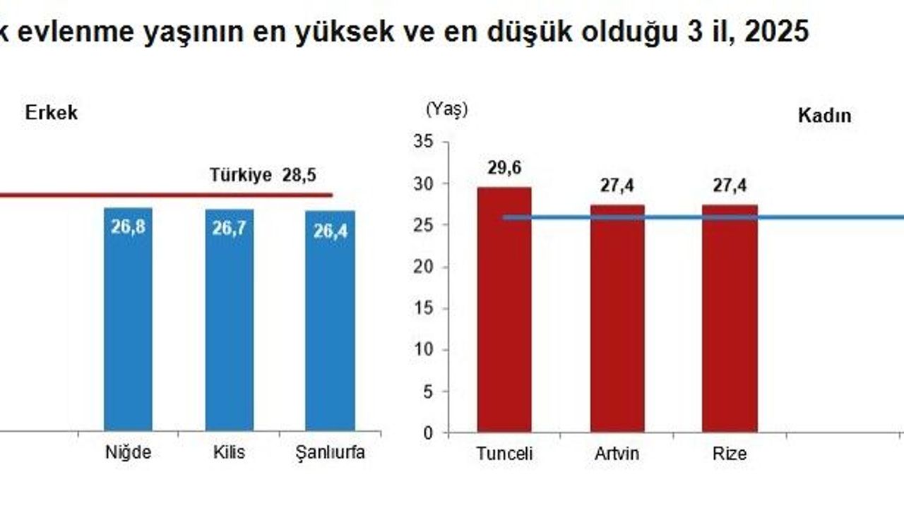 Resmi olarak ilk evliliğini 2025 yılında yapmış olan kadınların ortalama ilk evlenme yaşı 26 iken erkeklerin ortalama ilk evlenme yaşı 28,5 oldu. Ortalama ilk evlenme yaşının en yüksek olduğu il, kadınlarda 29,6 yaş, erkeklerde 32,4 yaş ile Tunceli oldu. Ortalama ilk evlenme yaşının en düşük olduğu il ise kadınlarda 23,7 yaş ile Kilis, erkeklerde 26,4 yaş ile Şanlıurfa oldu.