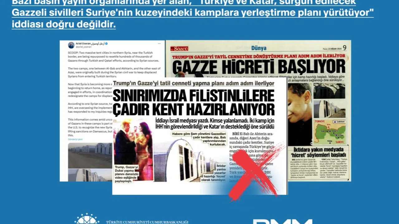 Bazı basın yayın organlarında yer alan, “Türkiye ve Katar’ın sürgün edilecek Gazzeli sivilleri Suriye’nin kuzeyindeki kamplara yerleştirme planı yaptığı” iddiası gerçeği yansıtmadığı bildirildi.ANKARA (İGFA) - Açıklama İletişim Başkanlığı Dezenformasyonla Mücadele Merkezi'nden geldi.