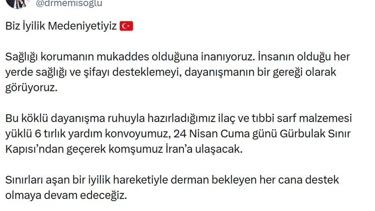Bakan Memişoğlu, sanal medya hesabından yaptığı açıklamada, 'Biz iyilik medeniyetiyiz. Sağlığı korumanın mukaddes olduğuna inanıyoruz. İnsanın olduğu her yerde sağlığı ve şifayı desteklemeyi, dayanışmanın bir gereği olarak görüyoruz. Bu köklü dayanışma ruhuyla hazırladığımız ilaç ve tıbbi sarf malzemesi yüklü 6 TIR'lık yardım konvoyumuz, 24 Nisan Cuma günü Gürbulak Sınır Kapısı'ndan geçerek komşumuz İran'a ulaşacak. Sınırları aşan bir iyilik hareketiyle derman bekleyen her cana destek olmaya devam edeceğiz. Yolumuz kardeşlik, yükümüz şifa olsun' dedi. (DHA)