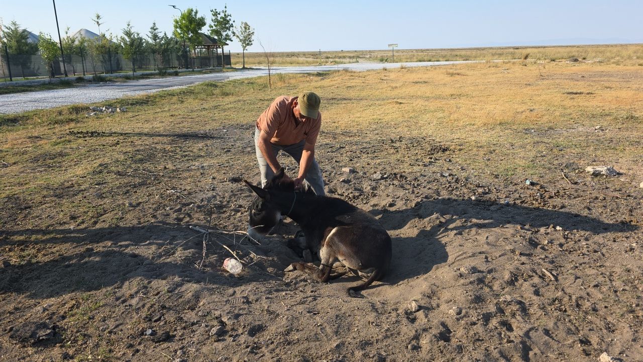 Eskil ilçesi Tuz Gölü kıyısında yaralı halde bulunan eşeğin durumunu gören vatandaşlar, ilçe belediye ekiplerine ihbarda bulundu.