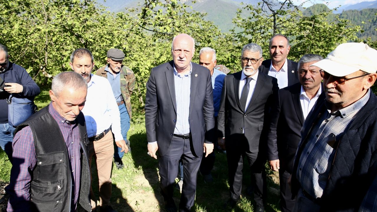 Doğankent ilçesinin Süttaşı Mahallesi'nde zirai dondan etkilenen fındık bahçelerini inceleyen Bayraktar, çiftçilerin taleplerini dinledi.