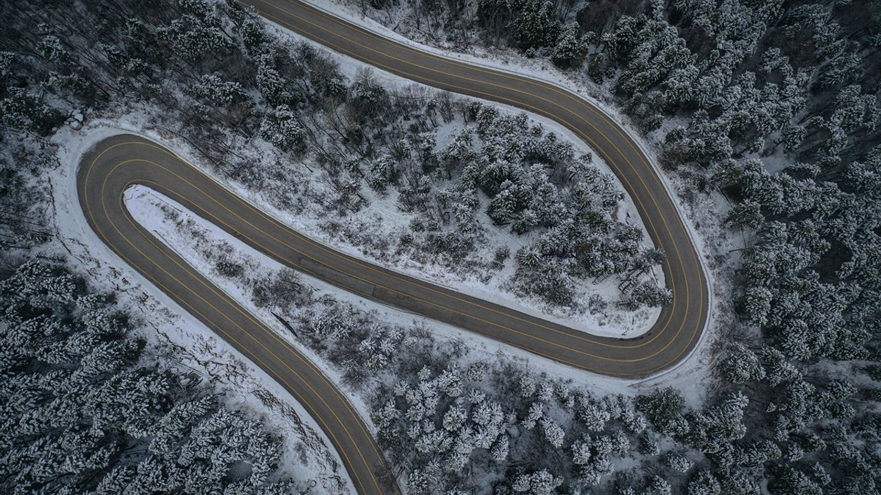 Uludağ'da kar yağışının ardından beyaz örtüsü ve kıvrımlı yolları dronla da havadan görüntülendi.
