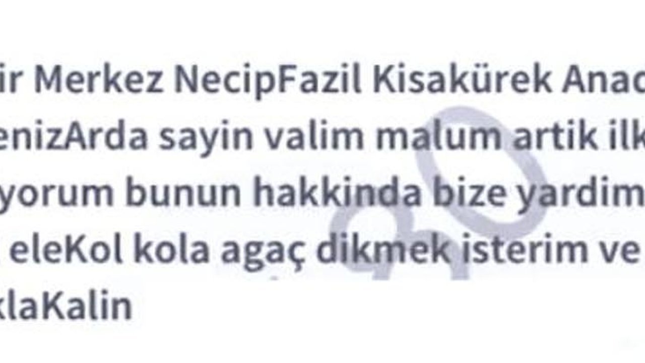 Necip Fazıl Kısakürek Anadolu İmam Hatip Lisesi 9'uncu sınıf öğrencisi Muhammed Deniz Arda, CİMER'e, 'Merhaba Sayın Valim. Ben, Iğdır Merkez Necip Fazıl Kısakürek Anadolu İmam Hatip Lisesi 9/B sınıfından Muhammed Deniz Arda. Malum artık ilkbahardayız ve yeşil Iğdır için fazla ağaç dikimi yapmak istiyorum. Bunun hakkında bize yardımcı olur musunuz? Orman Genel Müdürlüğü personelimizle el ele kol kola ağaç dikmek isterim. İnşallah bu isteğimiz okursunuz. İyi günler. Sağlıcakla kalın' yazdı.