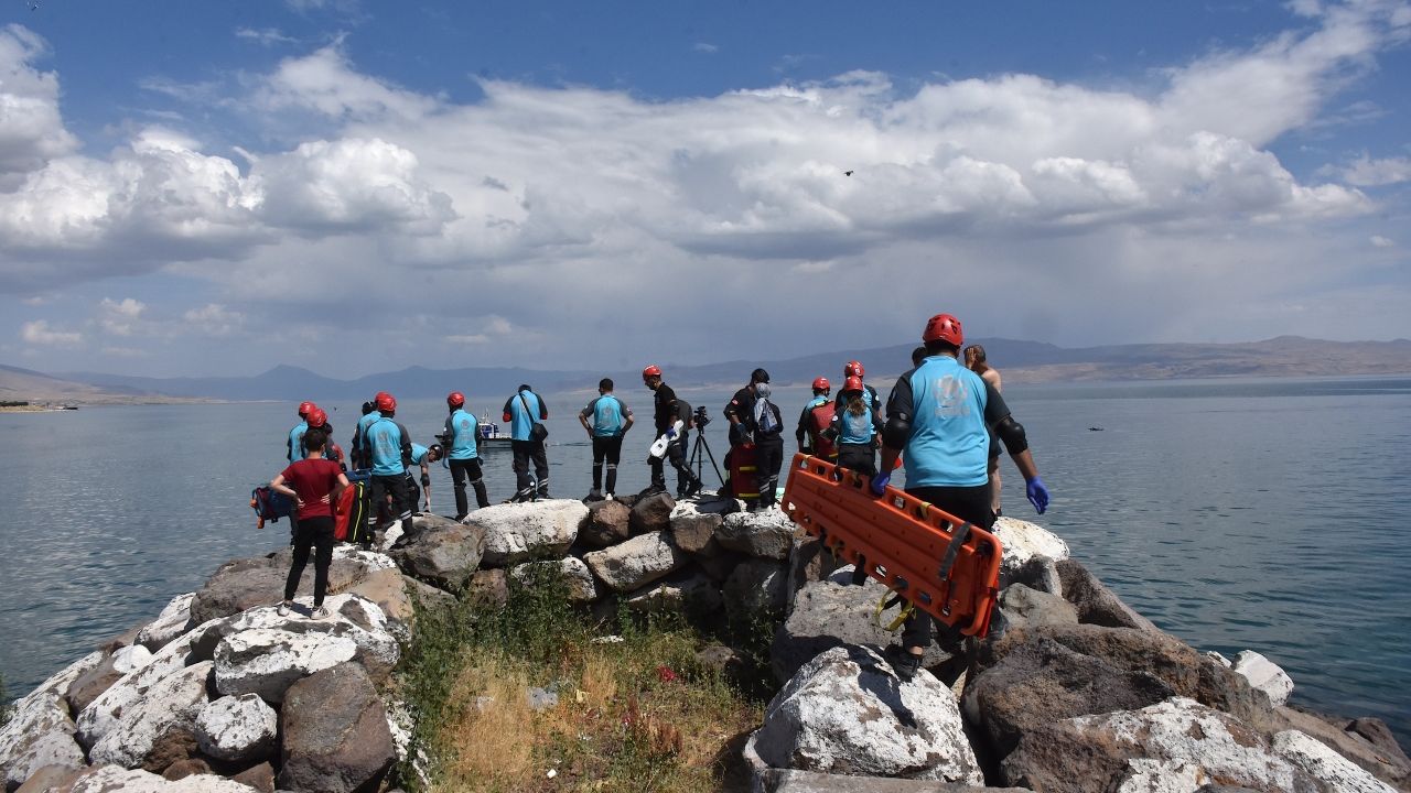 Van Gölü sahilinde gerçekleştirilen tatbikata, Van, Bitlis, Ağrı ve Hakkari'den UMKE, AFAD, polis, itfaiye ve Türk Kızılay ekipleri katıldı.