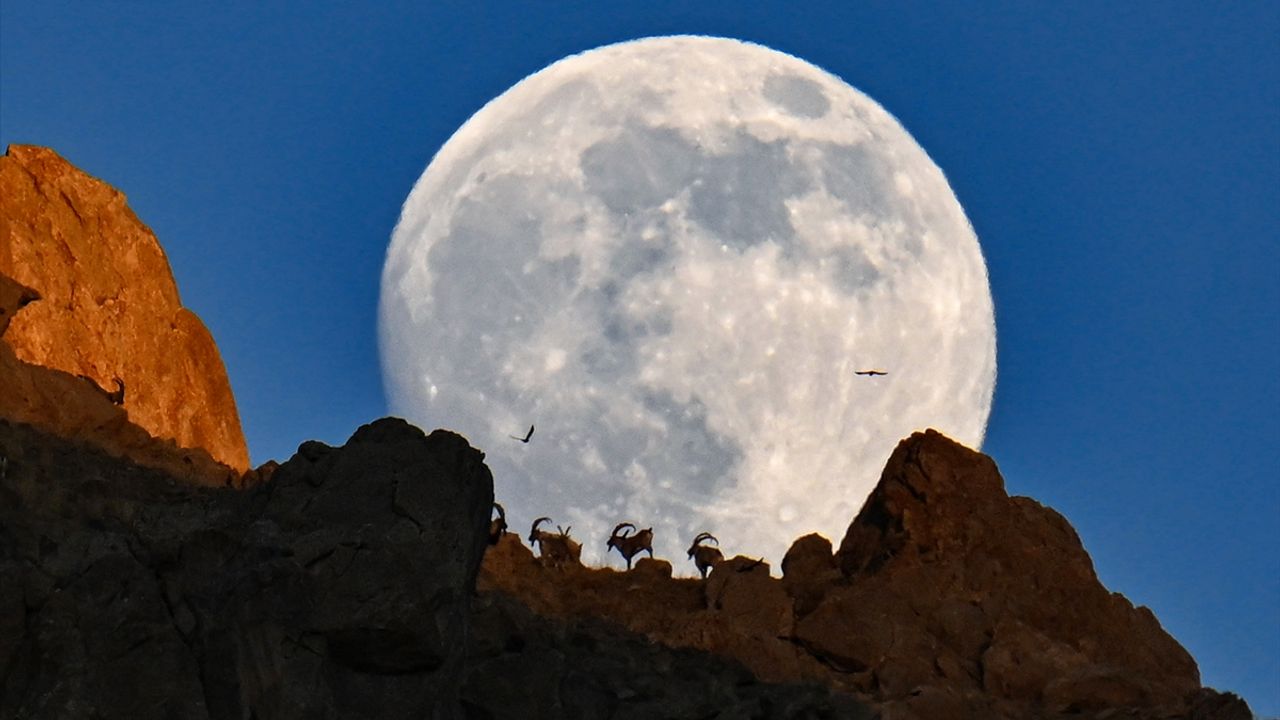 VAN (AA) - Van'ın Gürpınar ilçesinde nesli koruma altındaki yaban keçileri, dağın arkasından yükselen dolunayla birlikte görüntülendi.