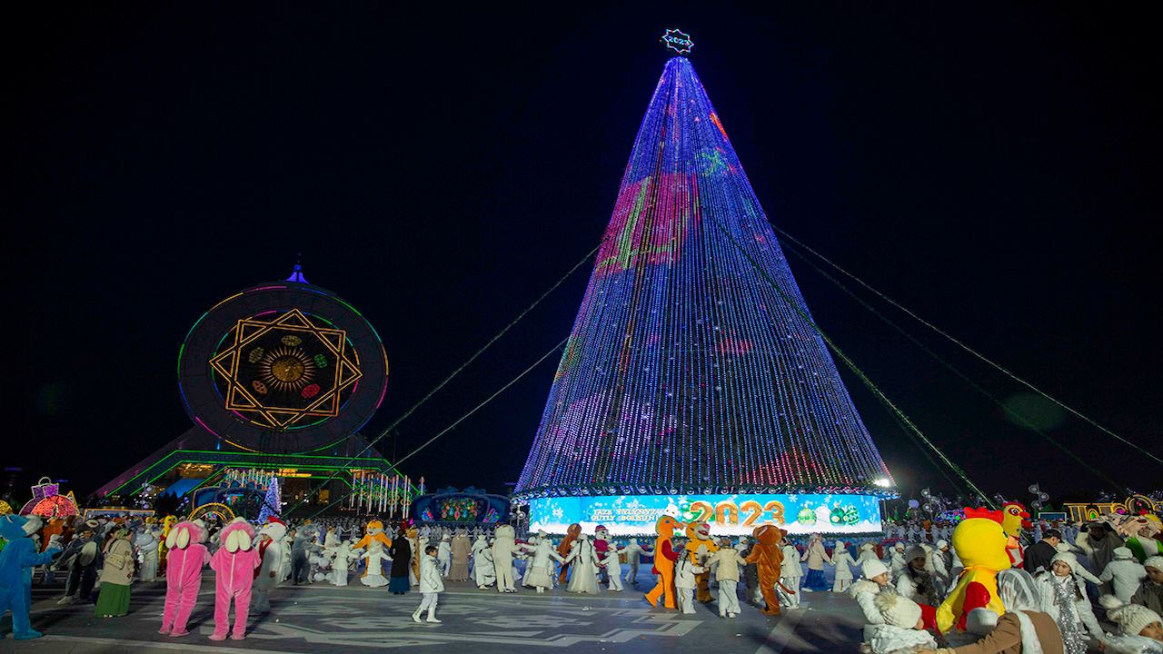 Türkmenistan’ın başkenti Aşkabat'ta yeni yıl kutlamaları kapsamında 43 metrelik yeni yıl ağacı yerleştirildi.Ülkede her sene gelenek haline gelen, Noel Baba ve torunu eşliğinde yeni yıl ağacının ışıklarını yakma merasimi yapıldı.Ağacın üzerinde, içinde "2023" yazan sekizgen bir yıldız bulunuyor.Yeni yıl ağacının ışıkları yakılırken, vatandaşlar ağacı görmek için bölgeyi ziyaret ediyor.