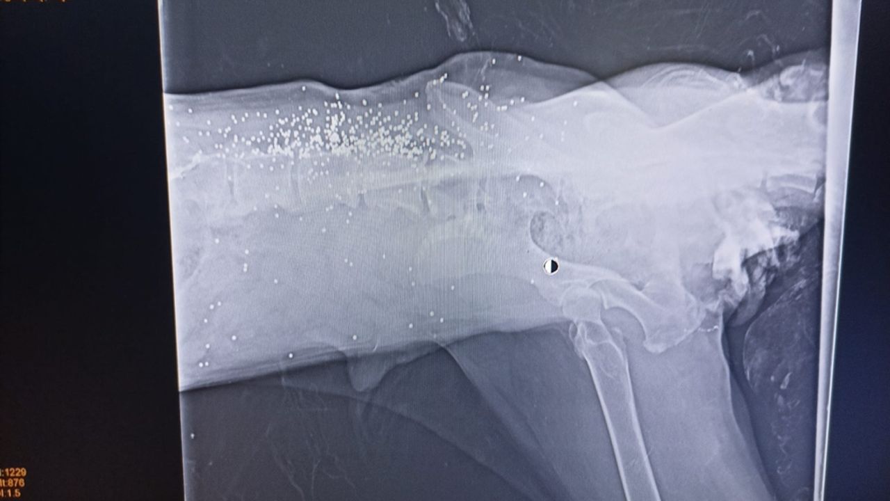 Bolu Belediyesi Veteriner İşleri Müdürlüğü'nde tedaviye alınan köpeğin, araç ezmesi nedeniyle arka bacaklarının kırıldığı belirlendi. Veterinerlikte çekilen röntgende köpeğin daha önce av tüfeğiyle vurulduğu tespit edildi. Köpeğin kalça ve bel bölgesinde saçmalar olduğu görüldü. Daha önce aksayarak yürüyen köpeğin, yürüme yetisini tamamen kaybettiği öğrenildi. (DHA)