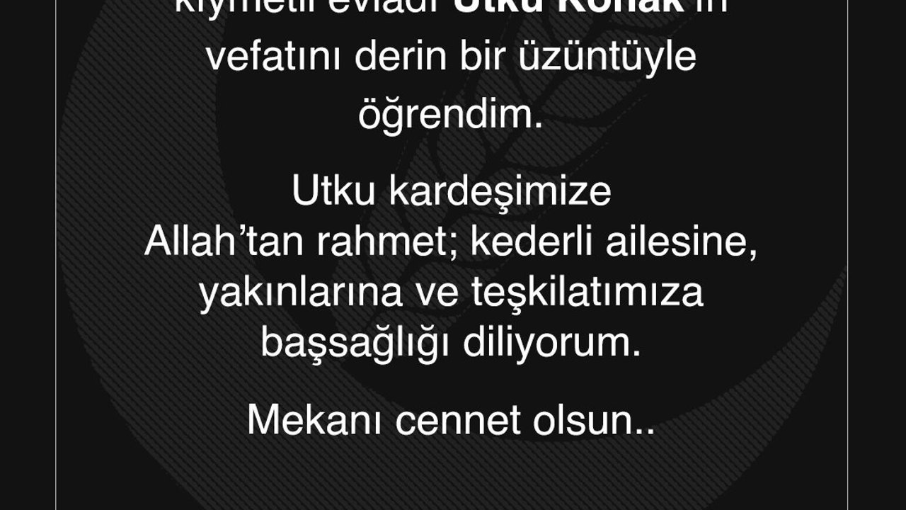 Yeniden Refah Partisi Genel Başkan Fatih Erbakan ile siyasi partiler taziye mesajı yayımladı. Fatih Erbakan, sanal medya hesabından yayımladığı mesajında 'Giresun İl Gençlik Kolları Başkanımız, teşkilatımızın kıymetli evladı Utku Konak'ın vefatını derin bir üzüntüyle öğrendim. Utku kardeşimize Allah'tan rahmet; kederli ailesine, yakınlarına ve teşkilatımıza başsağlığı diliyorum. Mekanı cennet olsun' ifadelerine yer verdi. (DHA)