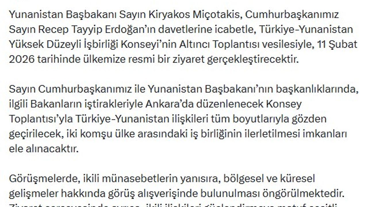 İletişim Başkanı Burhanettin Duran, sanal medya hesabından yaptığı açıklamada, 'Yunanistan Başbakanı Sayın Kiryakos Miçotakis, Cumhurbaşkanımız Sayın Recep Tayyip Erdoğan'ın davetlerine icabetle, Türkiye-Yunanistan Yüksek Düzeyli İşbirliği Konseyi'nin Altıncı Toplantısı vesilesiyle, 11 Şubat 2026 tarihinde ülkemize resmi bir ziyaret gerçekleştirecektir. Sayın Cumhurbaşkanımız ile Yunanistan Başbakanı'nın başkanlıklarında, ilgili Bakanların iştirakleriyle Ankara'da düzenlenecek Konsey Toplantısı'yla Türkiye-Yunanistan ilişkileri tüm boyutlarıyla gözden geçirilecek, iki komşu ülke arasındaki iş birliğinin ilerletilmesi imkanları ele alınacaktır. Görüşmelerde, ikili münasebetlerin yanı sıra bölgesel ve küresel gelişmeler hakkında görüş alışverişinde bulunulması öngörülmektedir. Ziyaret çerçevesinde ayrıca, ikili ilişkileri güçlendirmeye matuf çeşitli metinlerin imzalanması da gündemdedir' ifadelerini kullandı. (DHA)