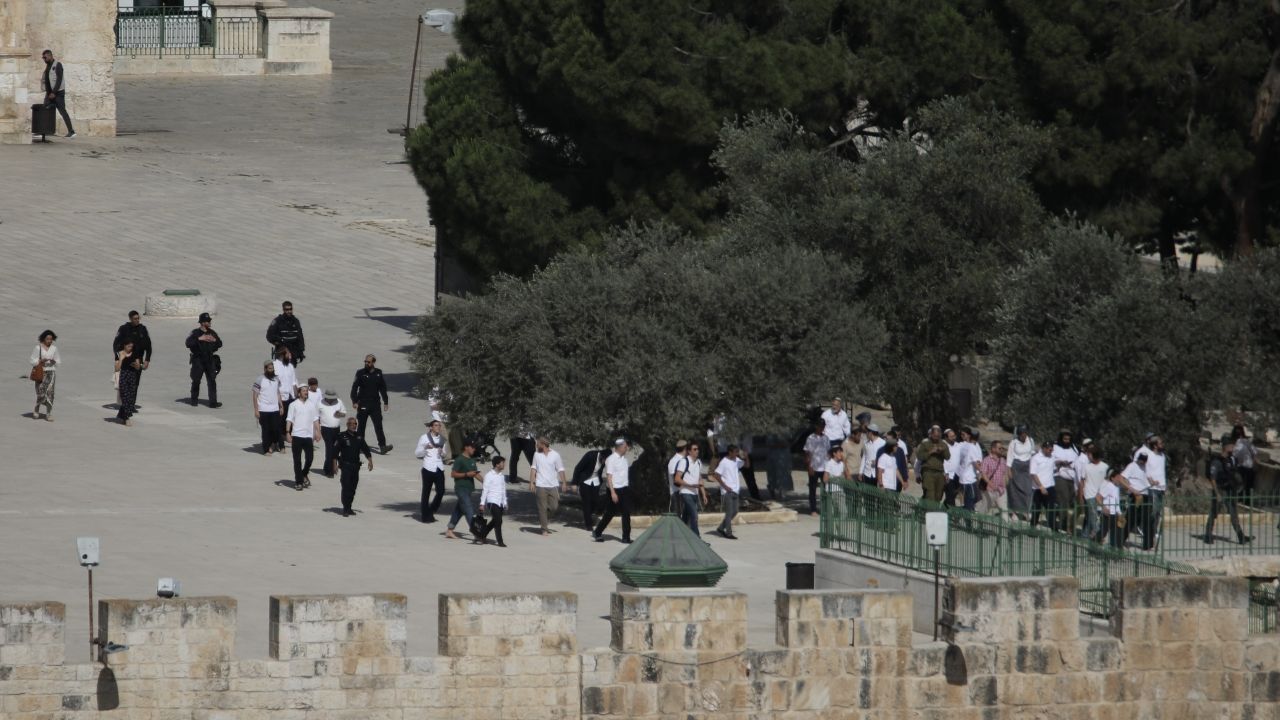Haberde, bazı Yahudilerin Mescid-i Aksa’ya Tevrat ruloları ile girmeye çalıştıklarına dikkat çekilen açıklamada, Burak Duvarı (Ağlama) bölgesi başta olmak üzere binlerce fanatik Yahudi’nin Harem-i Şerif’in çevresinde ve kapılarında kutlama ve ayinler düzenlediği vurgulandı.