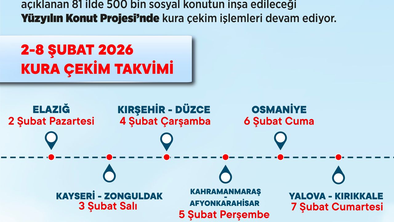 2-8 Şubat haftası takvimine göre; 2 Şubat Pazartesi Elazığ'da 3 bin 825, 3 Şubat Salı Kayseri'de 7 bin 562, Zonguldak'ta 1872, 4 Şubat Çarşamba Kırşehir'de 1633, Düzce'de 2 bin 470, 5 Şubat Perşembe Kahramanmaraş'ta 8 bin 195, Afyonkarahisar'da 4 bin 370, 6 Şubat Cuma Osmaniye'de 2 bin 990, 7 Şubat Cumartesi Yalova'da 1805, Kırıkkale'de 1736 konut için kura çekimi yapılacak. Böylece 2-8 Şubat haftasında toplam 36 bin 458 sosyal konutun daha hak sahipleri belirlenecek. (DHA)