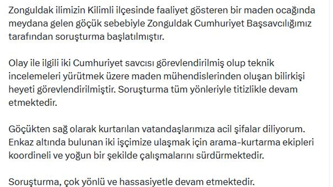 Adalet Bakanı Akın Gürlek, sanal medya üzerinden yaptığı paylaşımda, 'Zonguldak ilimizin Kilimli ilçesinde faaliyet gösteren bir maden ocağında meydana gelen göçük sebebiyle Zonguldak Cumhuriyet Başsavcılığımız tarafından soruşturma başlatılmıştır. Olay ile ilgili iki Cumhuriyet savcısı görevlendirilmiş olup teknik incelemeleri yürütmek üzere maden mühendislerinden oluşan bilirkişi heyeti görevlendirilmiştir. Soruşturma tüm yönleriyle titizlikle devam etmektedir. Göçükten sağ olarak kurtarılan vatandaşlarımıza acil şifalar diliyorum. Enkaz altında bulunan iki işçimize ulaşmak için arama-kurtarma ekipleri koordineli ve yoğun bir şekilde çalışmalarını sürdürmektedir. Soruşturma, çok yönlü ve hassasiyetle devam etmektedir' ifadelerine yer verdi. (DHA)